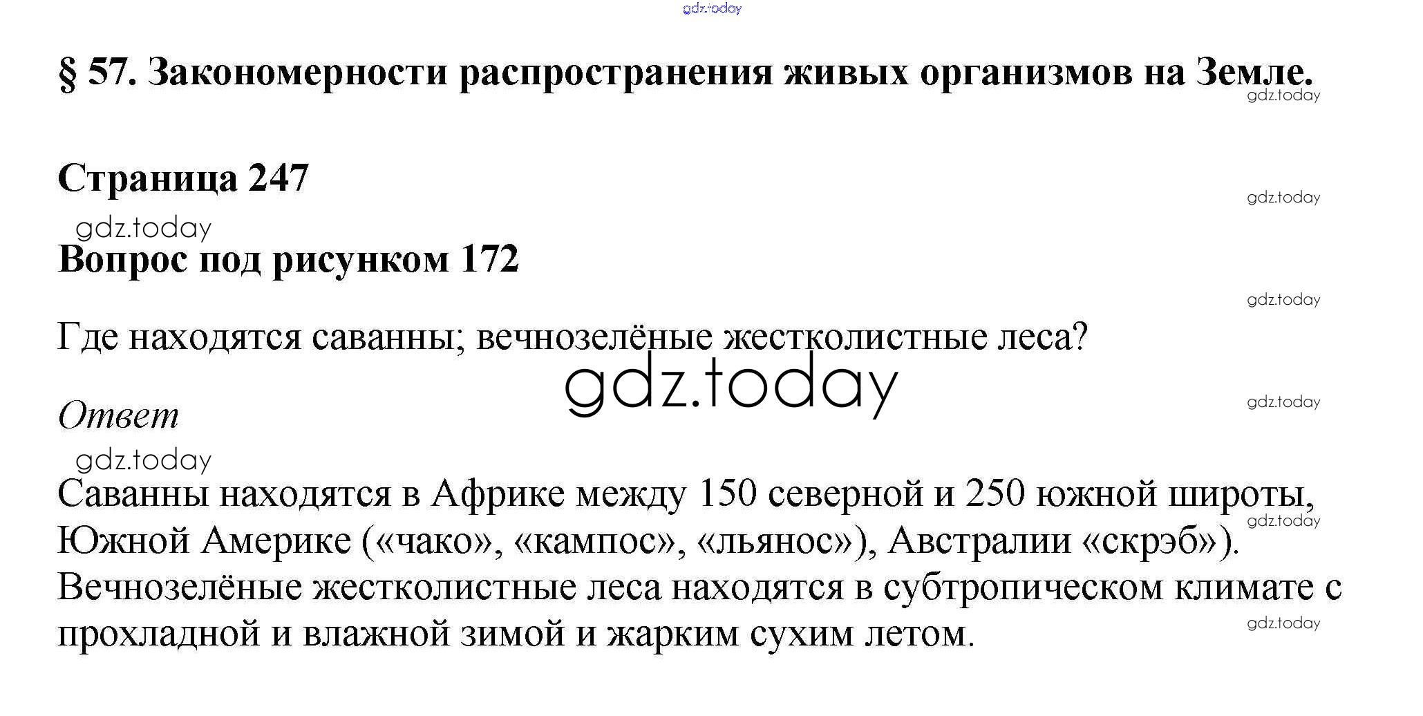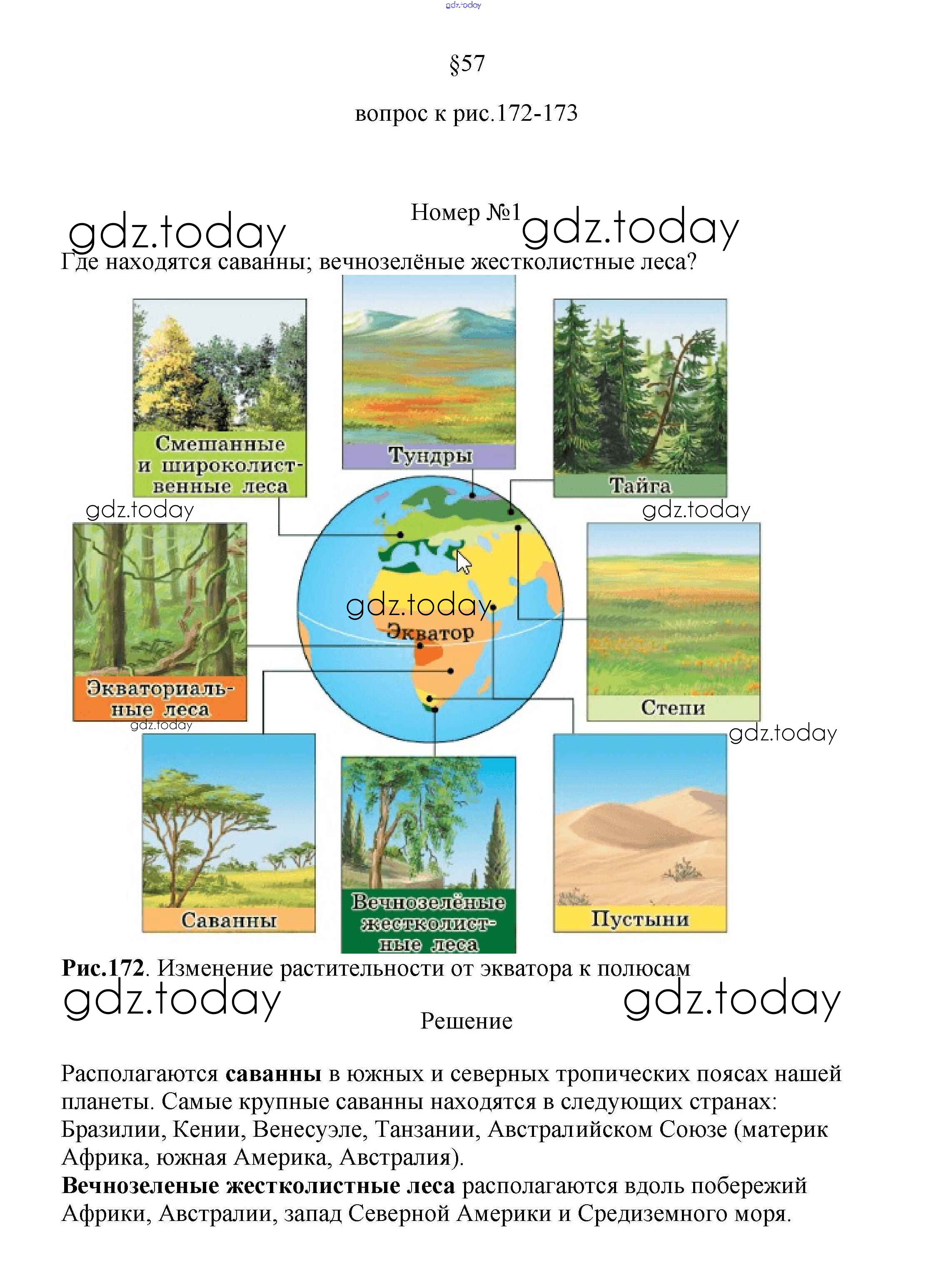 На страницах сайта gdz.today вы найдете учебный и вспомогательный материал, направленный на улучшения знаний школьной программы. ГДЗ - онлайн мир знаний Вопросы к рисункам §57. Закономерности распространения живых организмов на Земле рис. 172 Учебнику по Географии для 5-6 класса Климанова, Климанов Дрофа Вертикаль 2017