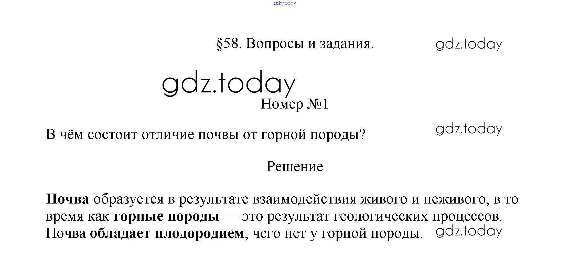 На страницах сайта gdz.today вы найдете учебный и вспомогательный материал, направленный на улучшения знаний школьной программы. ГДЗ - онлайн мир знаний Вопросы и задания §58. Почва как особое природное тело 1 Учебнику по Географии для 5-6 класса Климанова, Климанов Дрофа Вертикаль 2017