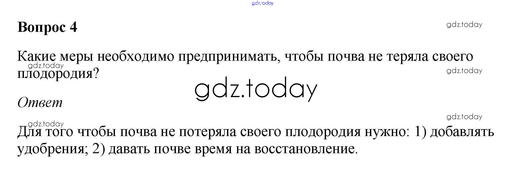 На страницах сайта gdz.today вы найдете учебный и вспомогательный материал, направленный на улучшения знаний школьной программы. ГДЗ - онлайн мир знаний Вопросы и задания §58. Почва как особое природное тело 4 Учебнику по Географии для 5-6 класса Климанова, Климанов Дрофа Вертикаль 2017