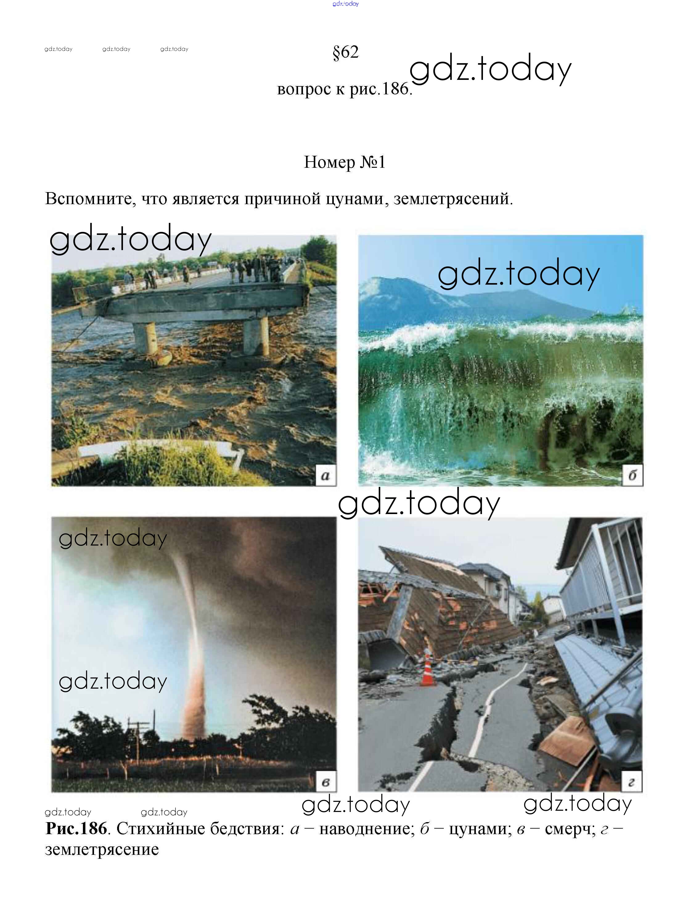 Ответы к Вопросы к рисункам §62. Стихийные бедствия и человек рис. 186 Учебнику по Географии для 5-6 класса Климанова, Климанов Дрофа Вертикаль 2017