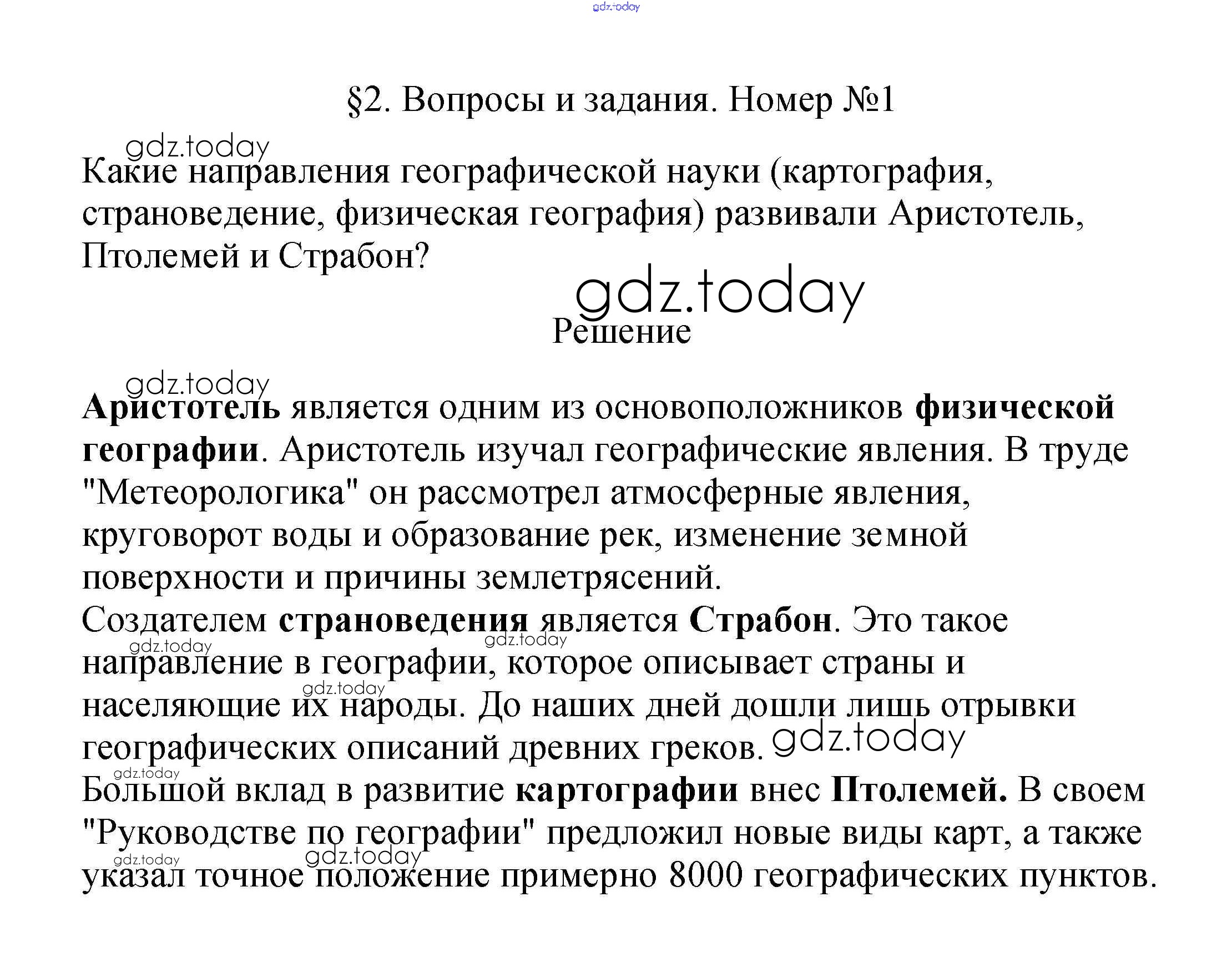 На страницах сайта gdz.today вы найдете учебный и вспомогательный материал, направленный на улучшения знаний школьной программы. ГДЗ - онлайн мир знаний Вопросы и задания Решение к §2. География в древнее время 1 Учебнику по Географии для 5 класса Летягин Просвещение 2021