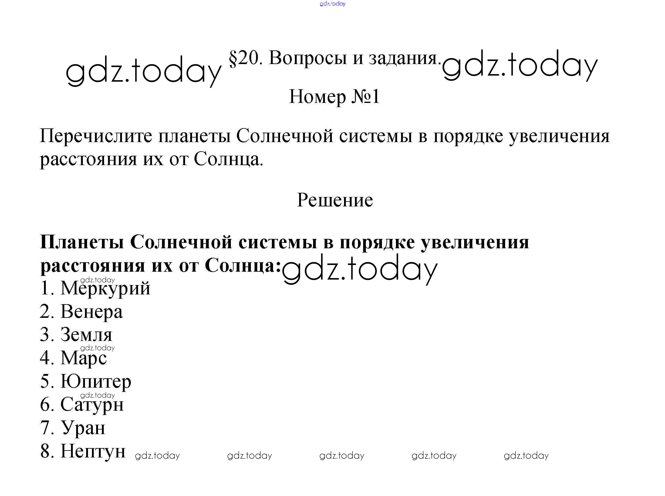 На страницах сайта gdz.today вы найдете учебный и вспомогательный материал, направленный на улучшения знаний школьной программы. ГДЗ - онлайн мир знаний Вопросы и задания Решение к §20. Земля среди других планет Солнечной системы 1 Учебнику по Географии для 5 класса Летягин Просвещение 2021