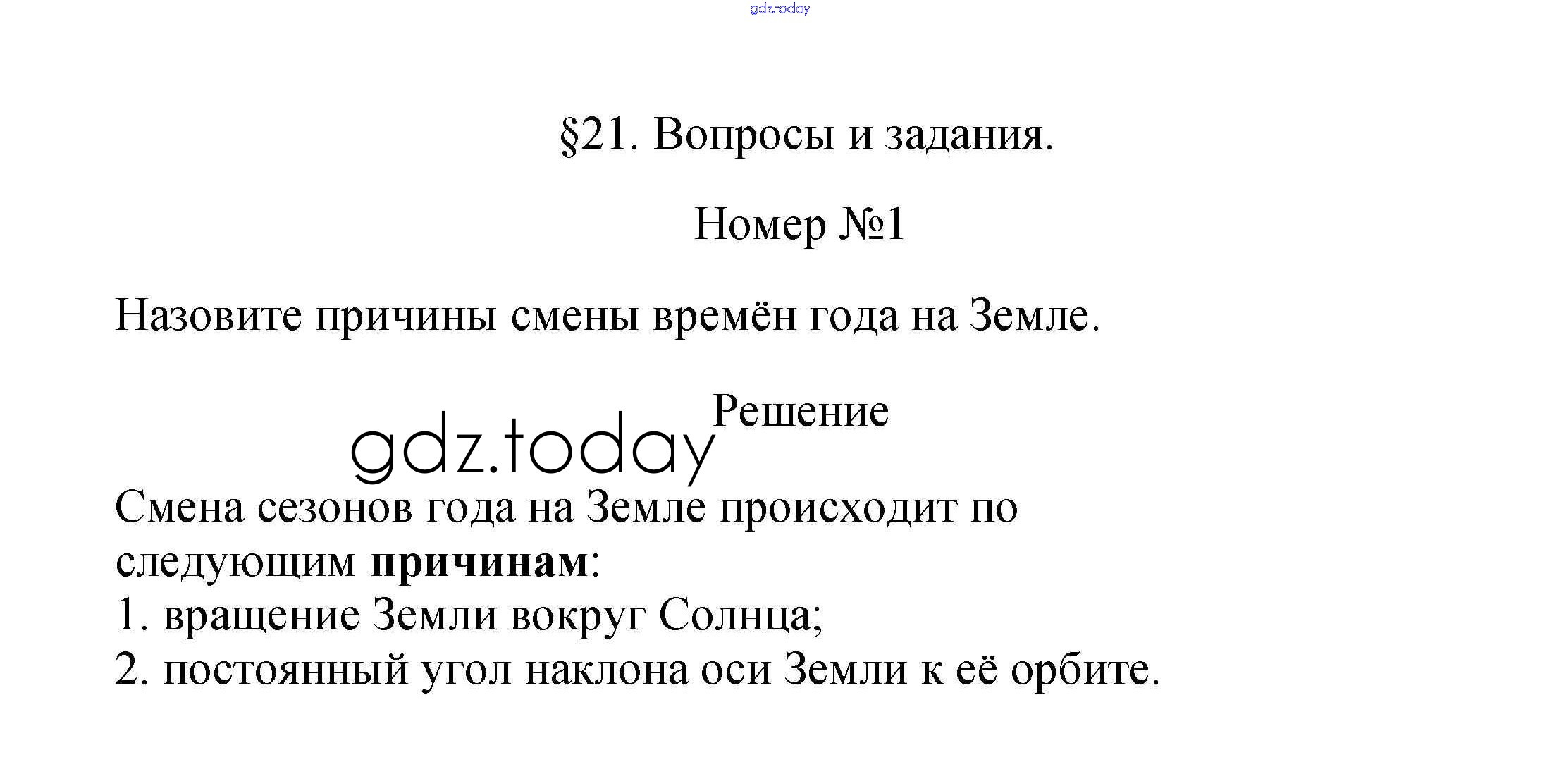 На страницах сайта gdz.today вы найдете учебный и вспомогательный материал, направленный на улучшения знаний школьной программы. ГДЗ - онлайн мир знаний Вопросы и задания Решение к §21. Движение Земли по околосолнечной орбите 1 Учебнику по Географии для 5 класса Летягин Просвещение 2021