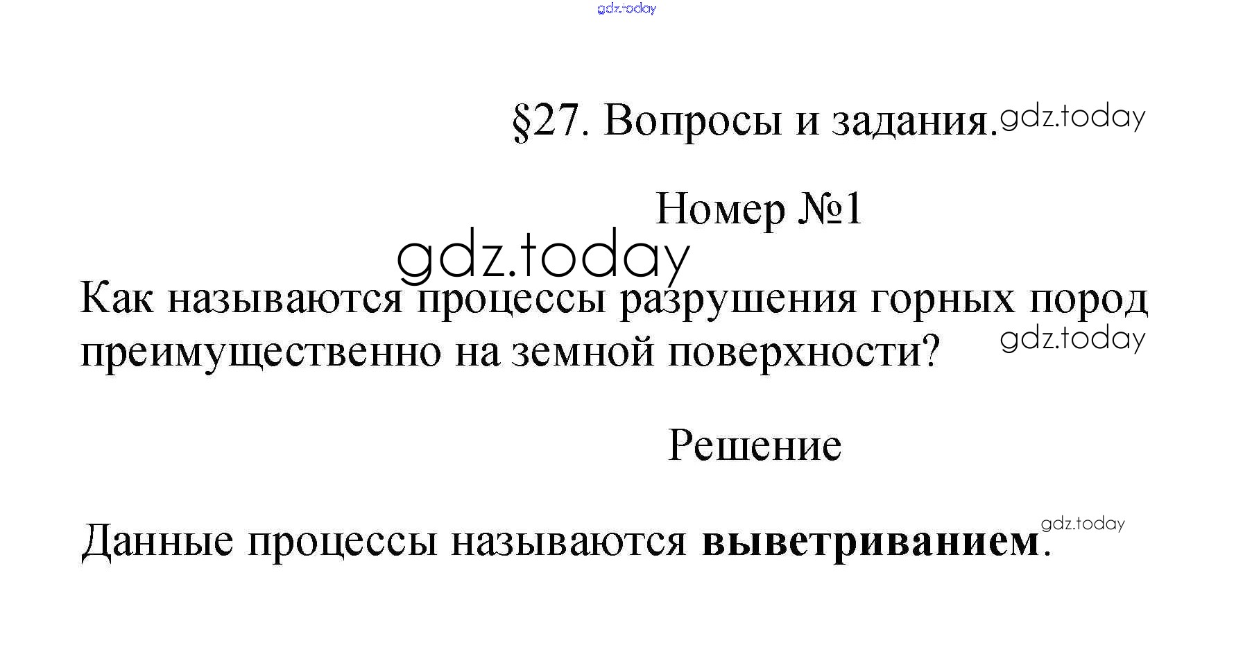На страницах сайта gdz.today вы найдете учебный и вспомогательный материал, направленный на улучшения знаний школьной программы. ГДЗ - онлайн мир знаний Вопросы и задания Решение к §27. Выветривание и перемещение горных пород 1 Учебнику по Географии для 5 класса Летягин Просвещение 2021