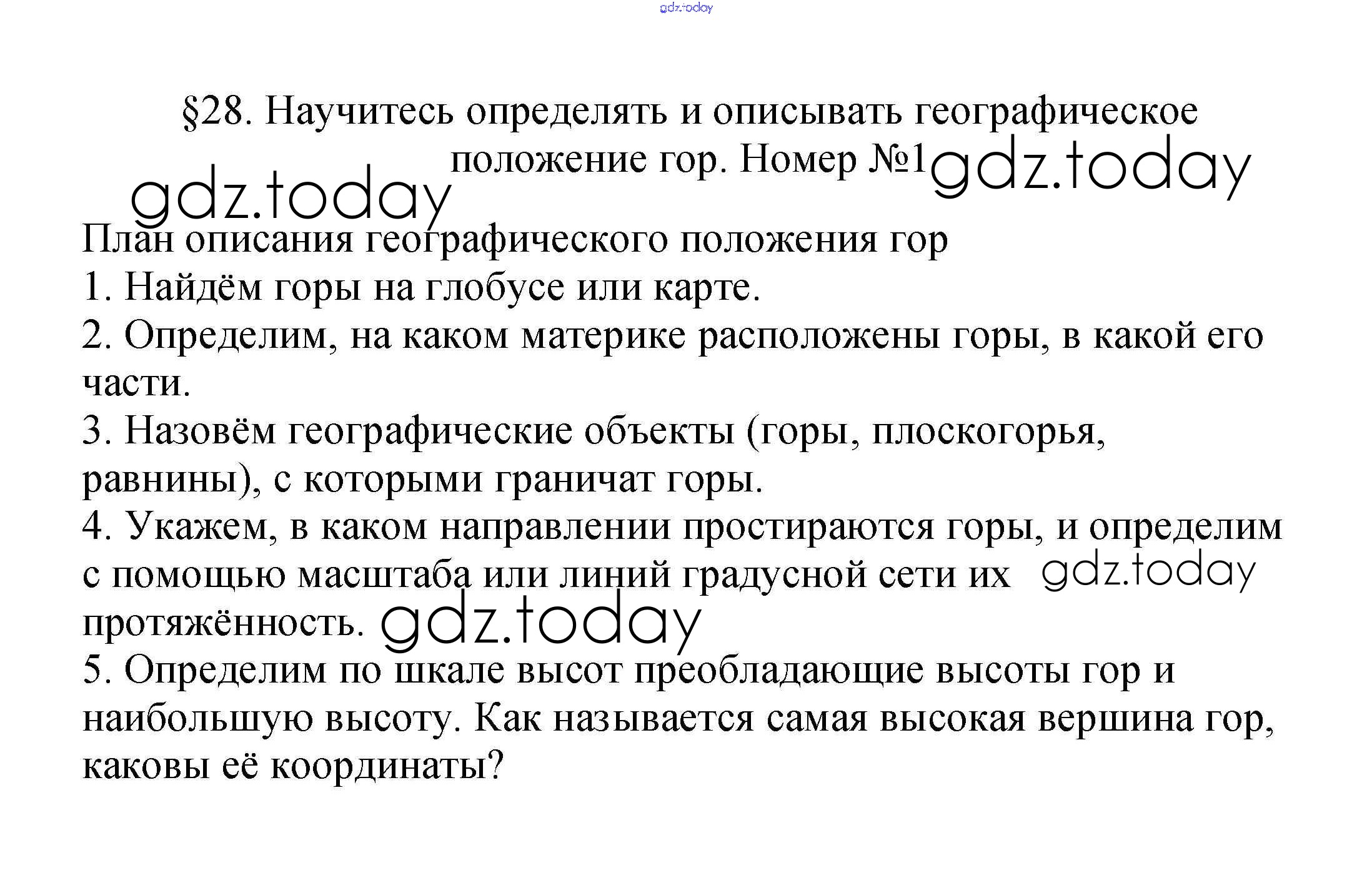 На страницах сайта gdz.today вы найдете учебный и вспомогательный материал, направленный на улучшения знаний школьной программы. ГДЗ - онлайн мир знаний Научитесь определять и описывать географическое положение гор Решение к §28. Рельеф земной поверхности. Горы суши 1 Учебнику по Географии для 5 класса Летягин Просвещение 2021