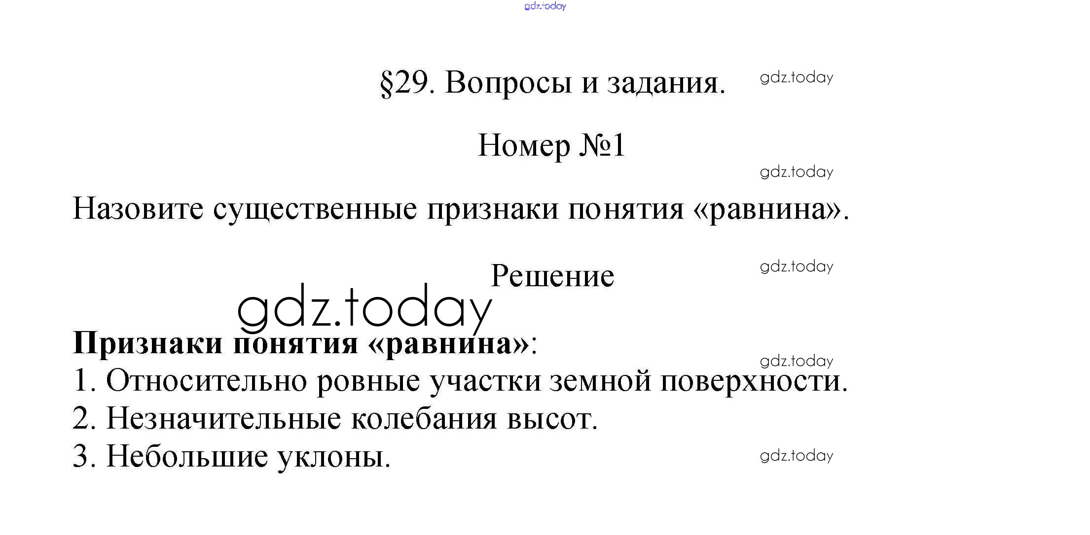 На страницах сайта gdz.today вы найдете учебный и вспомогательный материал, направленный на улучшения знаний школьной программы. ГДЗ - онлайн мир знаний Вопросы и задания Решение к §29. Равнины и плоскогорья суши 1 Учебнику по Географии для 5 класса Летягин Просвещение 2021