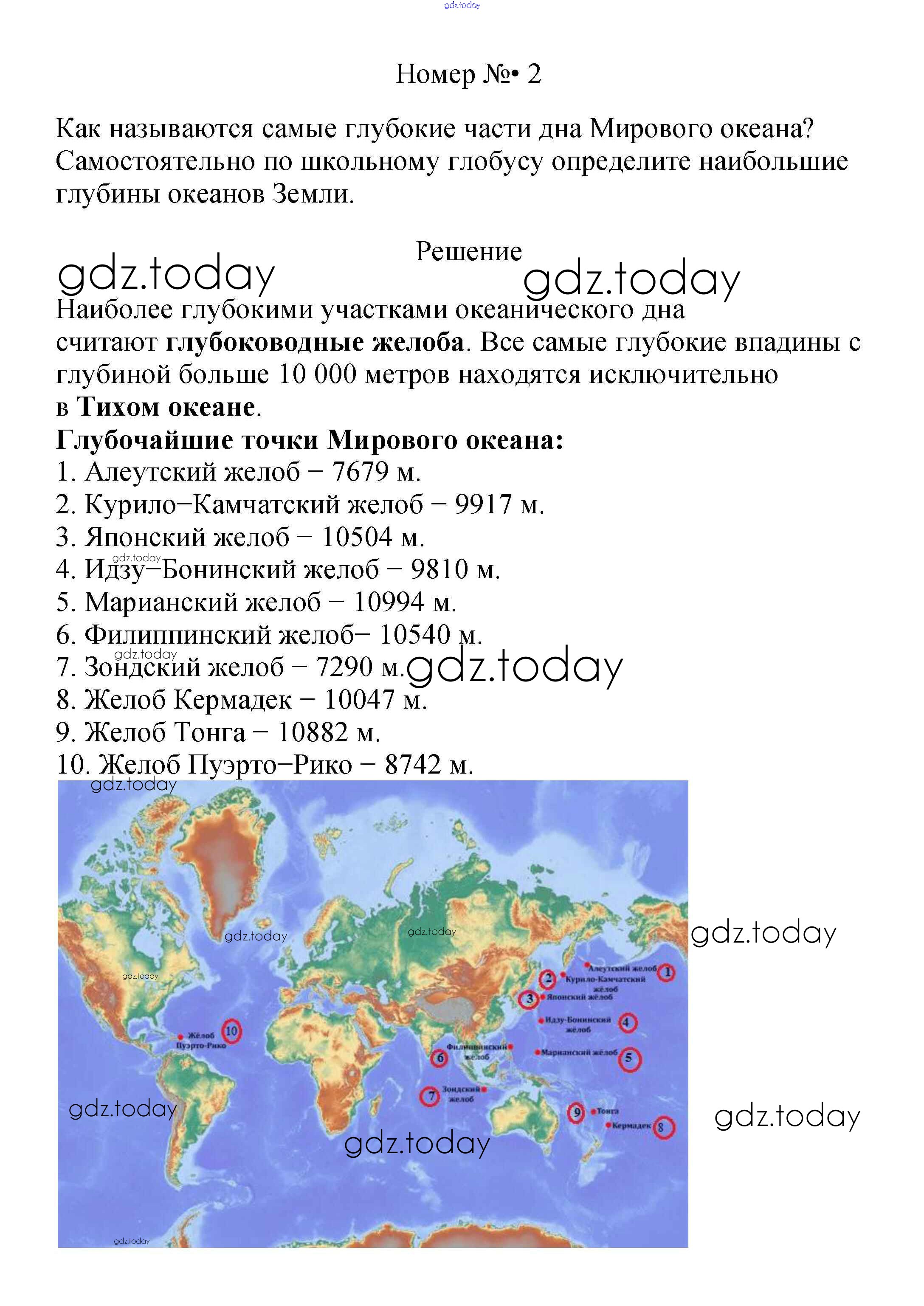 На страницах сайта gdz.today вы найдете учебный и вспомогательный материал, направленный на улучшения знаний школьной программы. ГДЗ - онлайн мир знаний Вопросы и задания Решение к §30. Рельеф дна Мирового океана 2 Учебнику по Географии для 5 класса Летягин Просвещение 2021