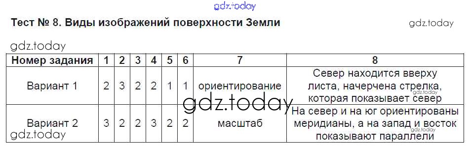 На страницах сайта gdz.today вы найдете учебный и вспомогательный материал, направленный на улучшения знаний школьной программы. ГДЗ - онлайн мир знаний Решение к тестам 8 Контрольно-измерительным материалам (КИМ) по Географии для 5 класса Жижина ВАКО 2018