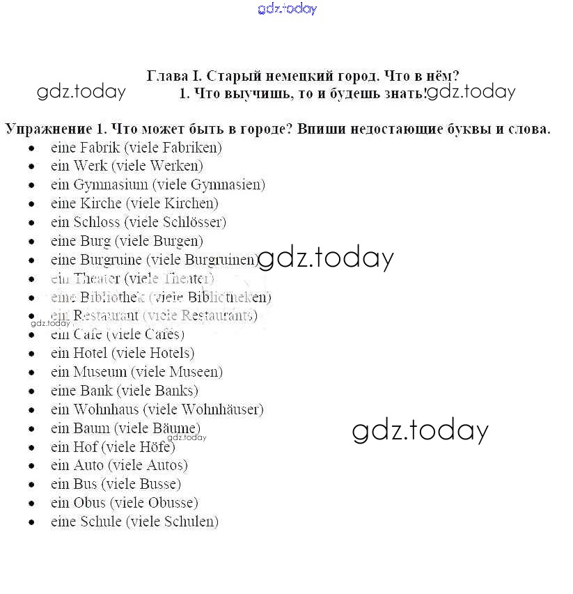 На страницах сайта gdz.today вы найдете учебный и вспомогательный материал, направленный на улучшения знаний школьной программы. ГДЗ - онлайн мир знаний Что выучишь, то и будешь знать! Решение к главе I. Старый немецкий город. Что в нём 1 Рабочей тетради по Немецкому языку для 5 класса Бим Просвещение 2005