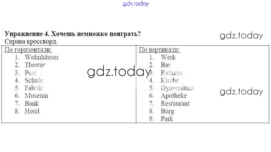 На страницах сайта gdz.today вы найдете учебный и вспомогательный материал, направленный на улучшения знаний школьной программы. ГДЗ - онлайн мир знаний Что мы уже знаем и умеем Решение к главе I. Старый немецкий город. Что в нём 4 Рабочей тетради по Немецкому языку для 5 класса Бим Просвещение 2005