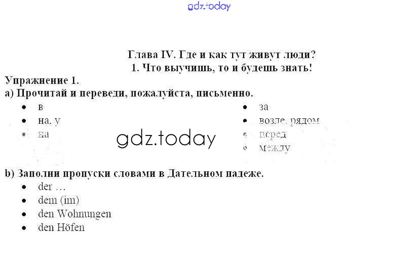 На страницах сайта gdz.today вы найдете учебный и вспомогательный материал, направленный на улучшения знаний школьной программы. ГДЗ - онлайн мир знаний Что выучишь, то и будешь знать! Решение к главе IV. Где и как тут живут люди 1 Рабочей тетради по Немецкому языку для 5 класса Бим Просвещение 2005