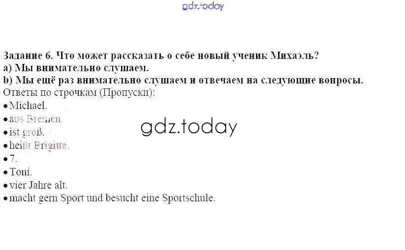 На страницах сайта gdz.today вы найдете учебный и вспомогательный материал, направленный на улучшения знаний школьной программы. ГДЗ - онлайн мир знаний Раздел 1 Здравствуй, 5 класс 6 Учебнику по Немецкому языку для 5 класса Бим Просвещение 2019