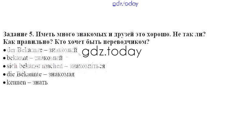 На страницах сайта gdz.today вы найдете учебный и вспомогательный материал, направленный на улучшения знаний школьной программы. ГДЗ - онлайн мир знаний Раздел 2 Здравствуй, 5 класс 5 Учебнику по Немецкому языку для 5 класса Бим Просвещение 2019