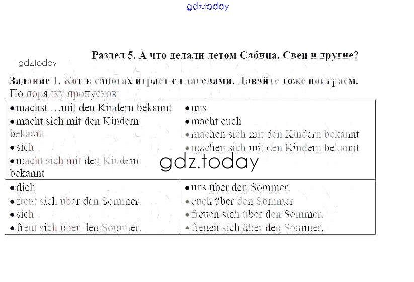 На страницах сайта gdz.today вы найдете учебный и вспомогательный материал, направленный на улучшения знаний школьной программы. ГДЗ - онлайн мир знаний Раздел 5 Здравствуй, 5 класс 1 Учебнику по Немецкому языку для 5 класса Бим Просвещение 2019