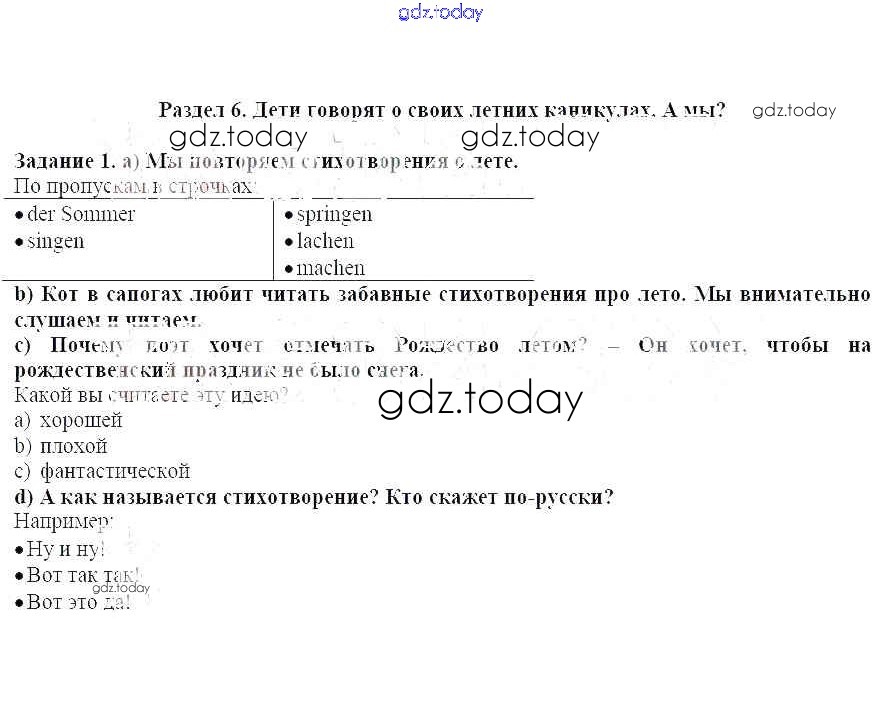На страницах сайта gdz.today вы найдете учебный и вспомогательный материал, направленный на улучшения знаний школьной программы. ГДЗ - онлайн мир знаний Раздел 6 Здравствуй, 5 класс 1 Учебнику по Немецкому языку для 5 класса Бим Просвещение 2019