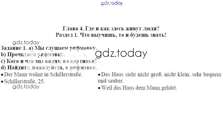 На страницах сайта gdz.today вы найдете учебный и вспомогательный материал, направленный на улучшения знаний школьной программы. ГДЗ - онлайн мир знаний Раздел 1 Решение к главе 4 1 Учебнику по Немецкому языку для 5 класса Бим Просвещение 2019