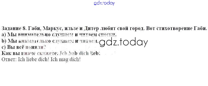 На страницах сайта gdz.today вы найдете учебный и вспомогательный материал, направленный на улучшения знаний школьной программы. ГДЗ - онлайн мир знаний Раздел 4 Решение к главе 4 8 Учебнику по Немецкому языку для 5 класса Бим Просвещение 2019