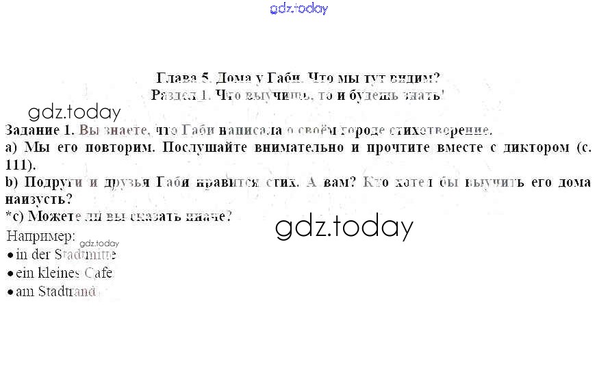 На страницах сайта gdz.today вы найдете учебный и вспомогательный материал, направленный на улучшения знаний школьной программы. ГДЗ - онлайн мир знаний Раздел 1 Решение к главе 5 1 Учебнику по Немецкому языку для 5 класса Бим Просвещение 2019