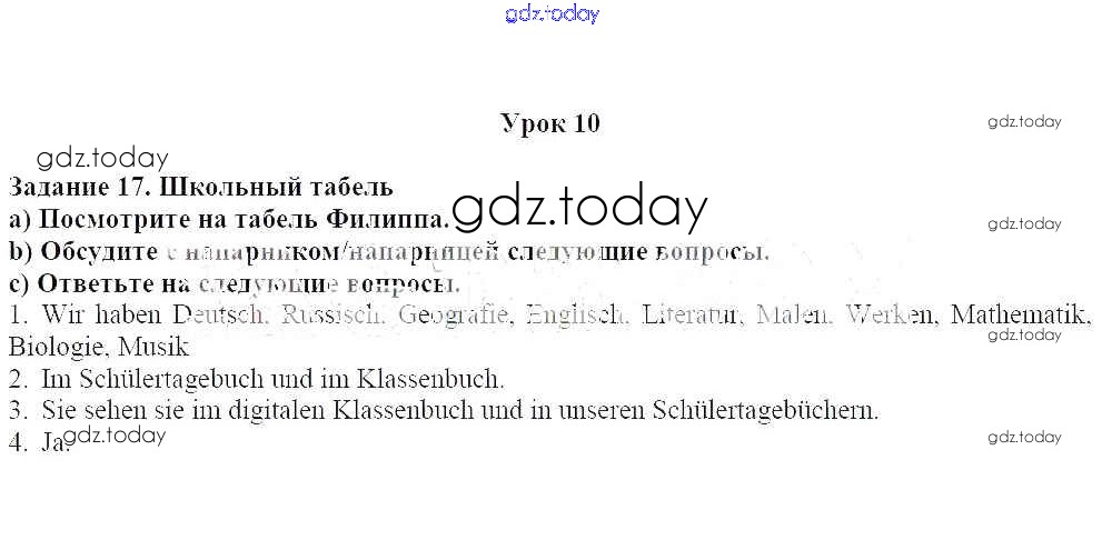 На страницах сайта gdz.today вы найдете учебный и вспомогательный материал, направленный на улучшения знаний школьной программы. ГДЗ - онлайн мир знаний Уроки 1-12 Решение к главе 2. Школа доставляет удовольствие 17 Учебнику по Немецкому языку для 5 класса Яковлева Углубленный уровень Просвещение Wunderkinder Plus 2020