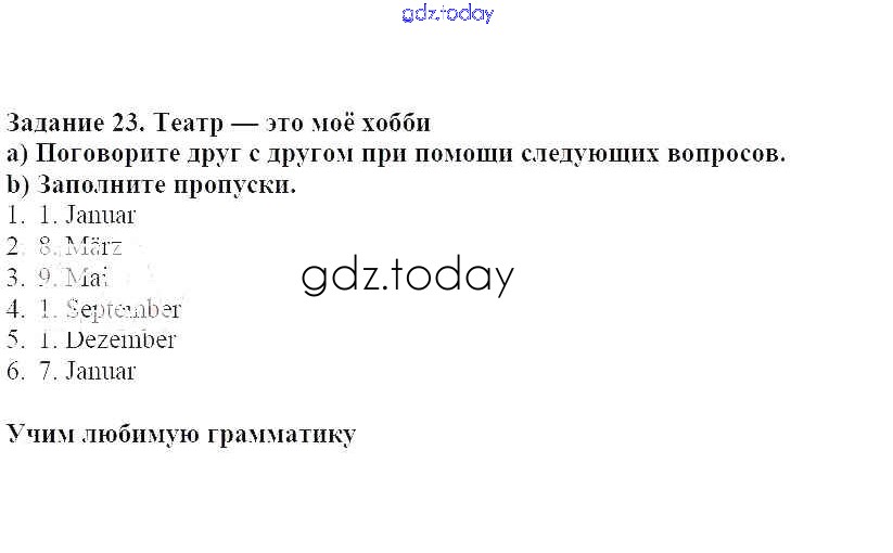 На страницах сайта gdz.today вы найдете учебный и вспомогательный материал, направленный на улучшения знаний школьной программы. ГДЗ - онлайн мир знаний Уроки 1-13 Решение к главе 6. Хобби и игра 23 Учебнику по Немецкому языку для 5 класса Яковлева Углубленный уровень Просвещение Wunderkinder Plus 2020