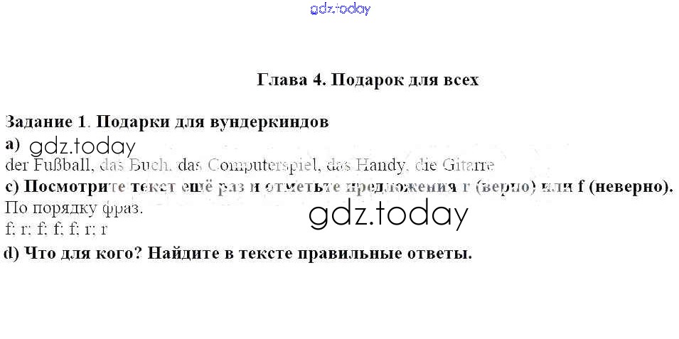 На страницах сайта gdz.today вы найдете учебный и вспомогательный материал, направленный на улучшения знаний школьной программы. ГДЗ - онлайн мир знаний Решение к главе 4. Подарок для всех 1 Учебнику по Немецкому языку для 5 класса Яцковская Просвещение Wunderkinder 2017