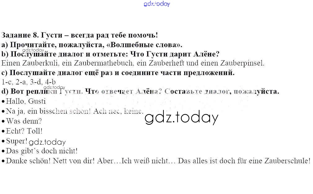 На страницах сайта gdz.today вы найдете учебный и вспомогательный материал, направленный на улучшения знаний школьной программы. ГДЗ - онлайн мир знаний Решение к главе 7. Завтра всё начинается 8 Учебнику по Немецкому языку для 5 класса Яцковская Просвещение Wunderkinder 2017