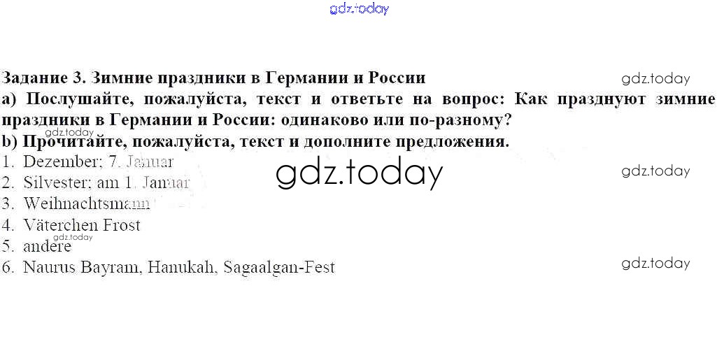 На страницах сайта gdz.today вы найдете учебный и вспомогательный материал, направленный на улучшения знаний школьной программы. ГДЗ - онлайн мир знаний Решение к главе 9. Наступает Рождество! 3 Учебнику по Немецкому языку для 5 класса Яцковская Просвещение Wunderkinder 2017