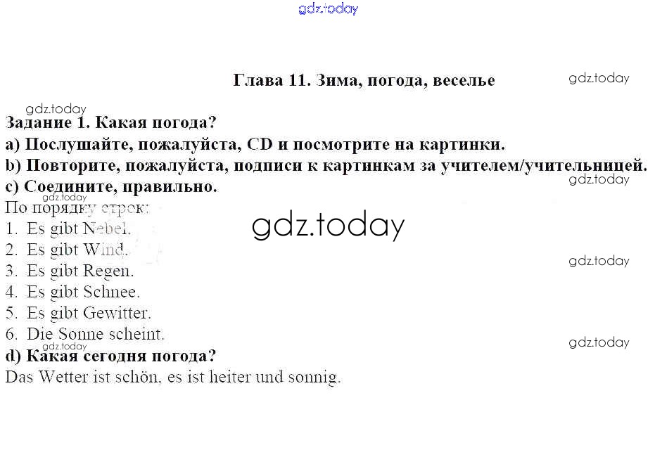 На страницах сайта gdz.today вы найдете учебный и вспомогательный материал, направленный на улучшения знаний школьной программы. ГДЗ - онлайн мир знаний Решение к главе 11. Зима, погода, веселье 1 Учебнику по Немецкому языку для 5 класса Яцковская Просвещение Wunderkinder 2017