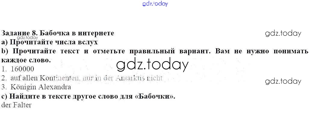 На страницах сайта gdz.today вы найдете учебный и вспомогательный материал, направленный на улучшения знаний школьной программы. ГДЗ - онлайн мир знаний Решение к главе 12. Числа, бабочка, пираты 8 Учебнику по Немецкому языку для 5 класса Яцковская Просвещение Wunderkinder 2017