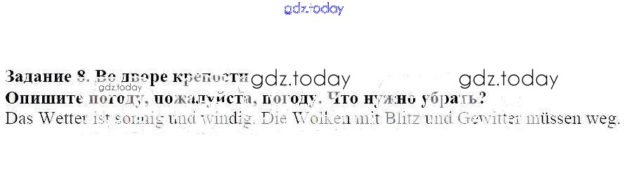 На страницах сайта gdz.today вы найдете учебный и вспомогательный материал, направленный на улучшения знаний школьной программы. ГДЗ - онлайн мир знаний Решение к главе 15. Встреча в крепости 8 Учебнику по Немецкому языку для 5 класса Яцковская Просвещение Wunderkinder 2017