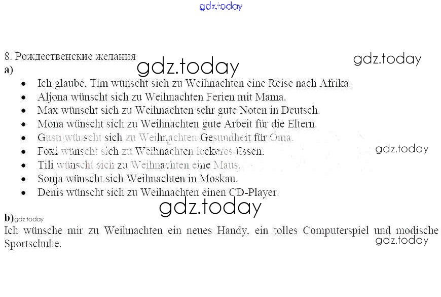На страницах сайта gdz.today вы найдете учебный и вспомогательный материал, направленный на улучшения знаний школьной программы. ГДЗ - онлайн мир знаний Глава 9 Решение к части 2 8 Рабочей тетради по Немецкому языку для 5 класса Яцковская Просвещение Wunderkinder 2019