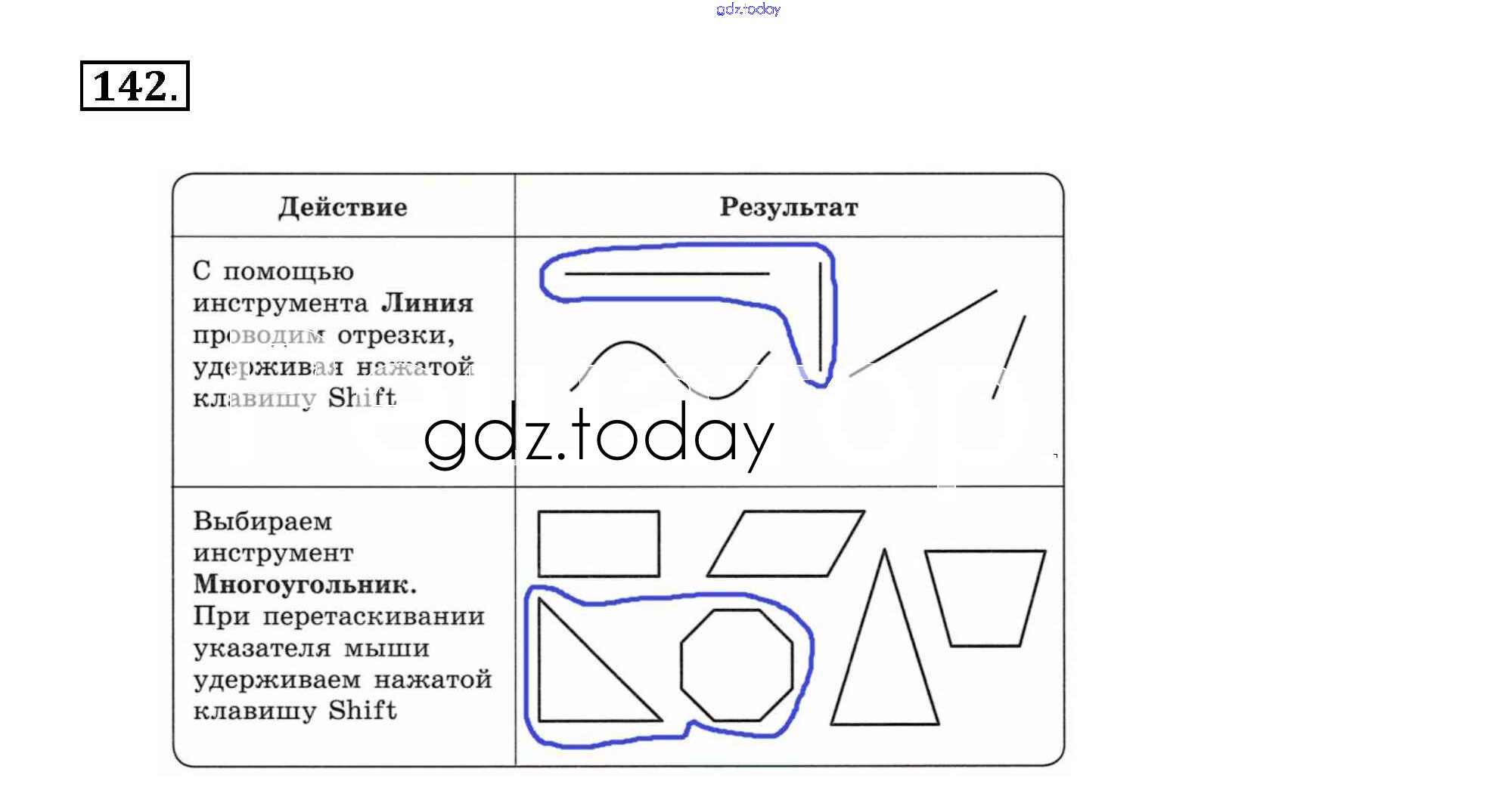 На страницах сайта gdz.today вы найдете учебный и вспомогательный материал, направленный на улучшения знаний школьной программы. ГДЗ - онлайн мир знаний Решение к заданиям 142 Рабочей тетради по Информатике для 5 класса Босова Бином 2016