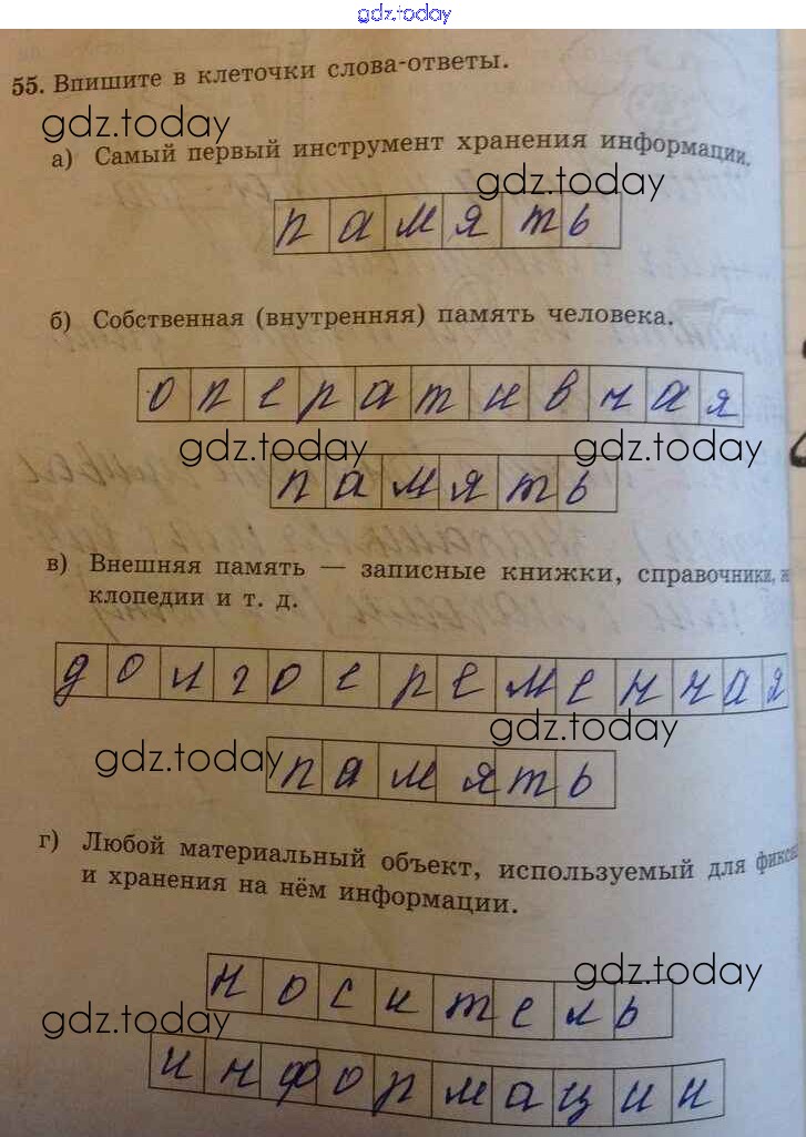 На страницах сайта gdz.today вы найдете учебный и вспомогательный материал, направленный на улучшения знаний школьной программы. ГДЗ - онлайн мир знаний Решение к заданиям 55 Рабочей тетради по Информатике для 5 класса Босова Бином 2016