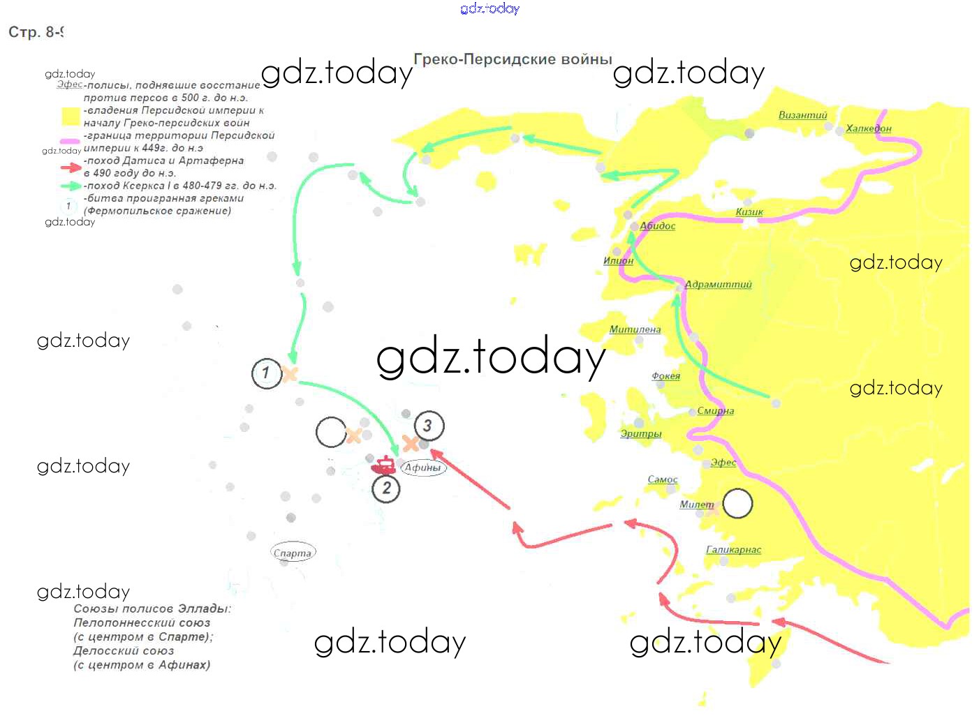 На страницах сайта gdz.today вы найдете учебный и вспомогательный материал, направленный на улучшения знаний школьной программы. ГДЗ - онлайн мир знаний Страницы (решение)  стр.9. Греко-персидские войны Контурным картам по Истории для 5 класса Друбачевская, Уколова  Просвещение  2017