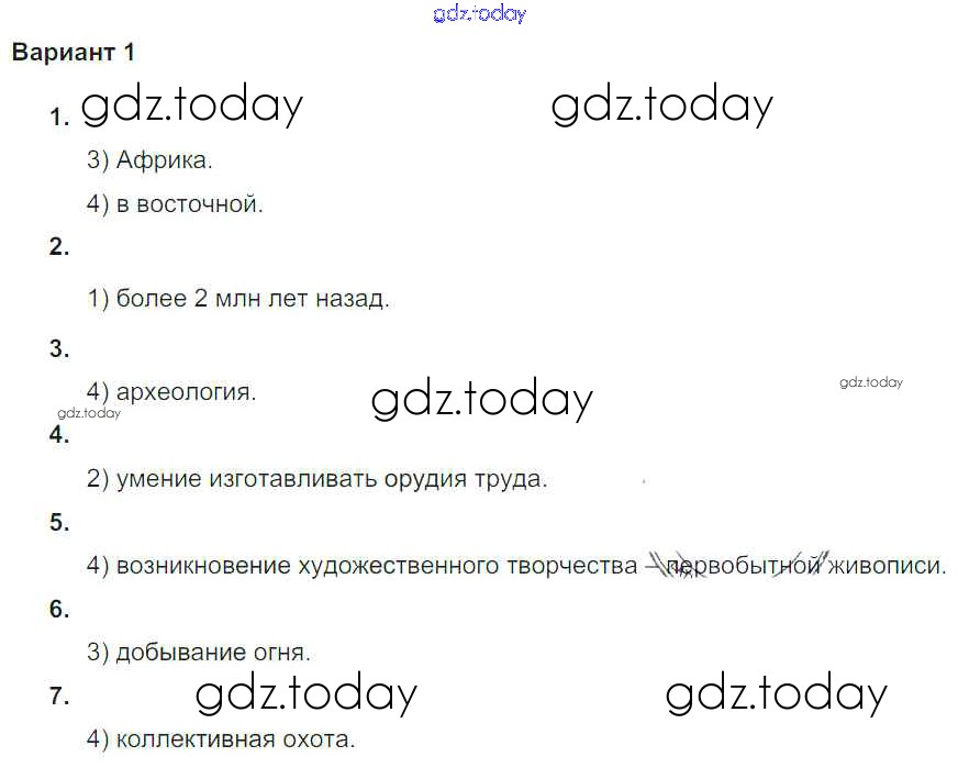 На страницах сайта gdz.today вы найдете учебный и вспомогательный материал, направленный на улучшения знаний школьной программы. ГДЗ - онлайн мир знаний Проверочная работа Решение к главе 1. Первобытные собиратели и охотники Вариант №1 Проверочным и контрольным работам по Истории для 5 класса Крючкова  Просвещение  2015