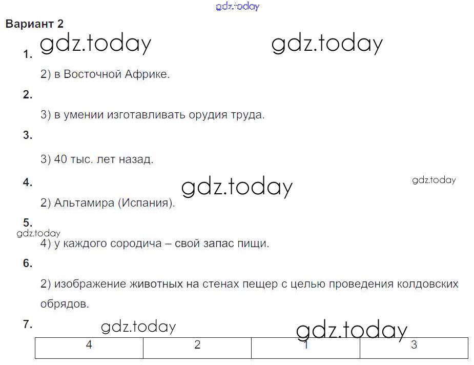 На страницах сайта gdz.today вы найдете учебный и вспомогательный материал, направленный на улучшения знаний школьной программы. ГДЗ - онлайн мир знаний Проверочная работа Решение к главе 1. Первобытные собиратели и охотники Вариант №2 Проверочным и контрольным работам по Истории для 5 класса Крючкова  Просвещение  2015