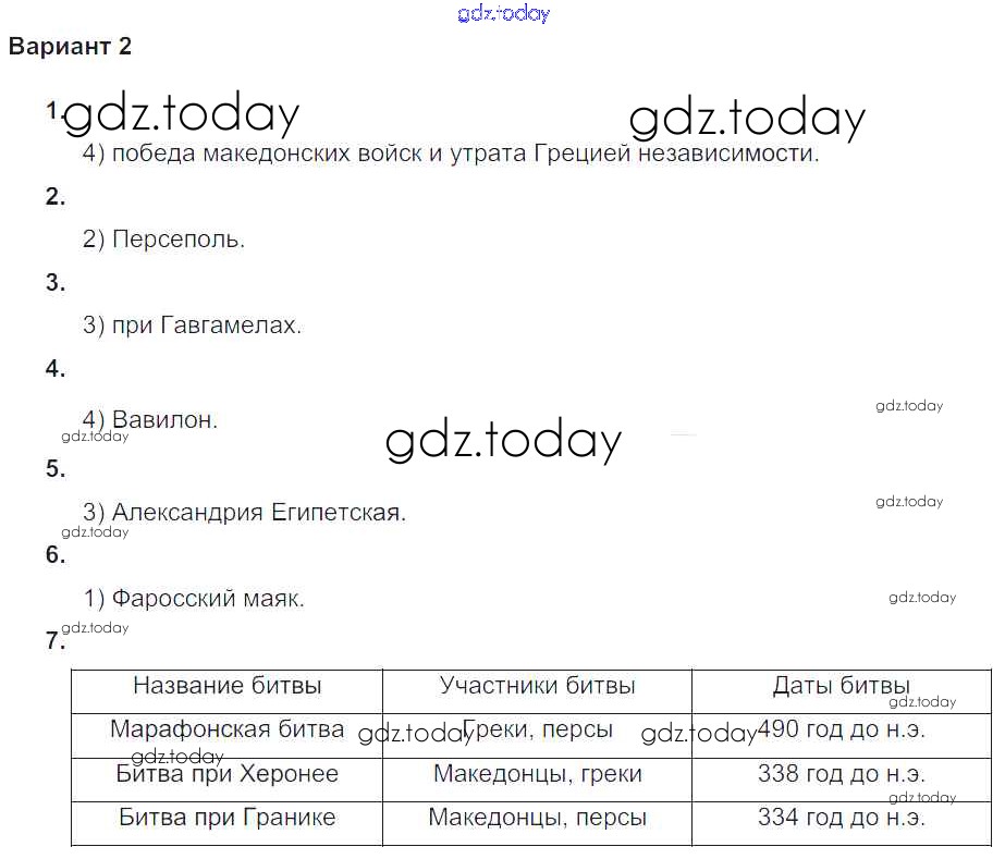 На страницах сайта gdz.today вы найдете учебный и вспомогательный материал, направленный на улучшения знаний школьной программы. ГДЗ - онлайн мир знаний Итоговая контрольная работа к главе Македонские завоевания в IV веке до н.э. Решение к главе 10. Македонские завоевания в IV (4-м) веке до н. э. Древний Рим Вариант №2 Проверочным и контрольным работам по Истории для 5 класса Крючкова  Просвещение  2015