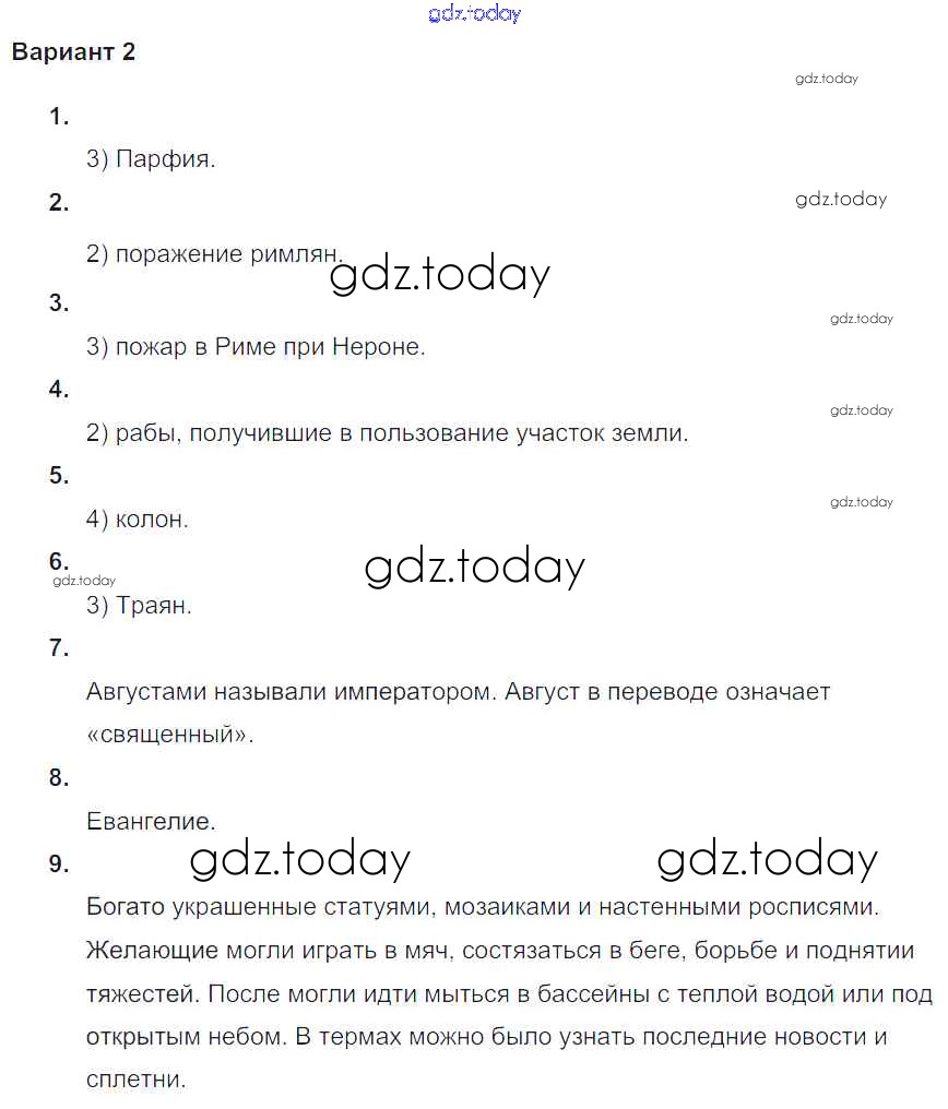 На страницах сайта gdz.today вы найдете учебный и вспомогательный материал, направленный на улучшения знаний школьной программы. ГДЗ - онлайн мир знаний Итоговая контрольная работа к главе Римская империя в первые века нашей эры Решение к главе 14. Римская империя в первые века нашей эры Вариант №2 Проверочным и контрольным работам по Истории для 5 класса Крючкова  Просвещение  2015