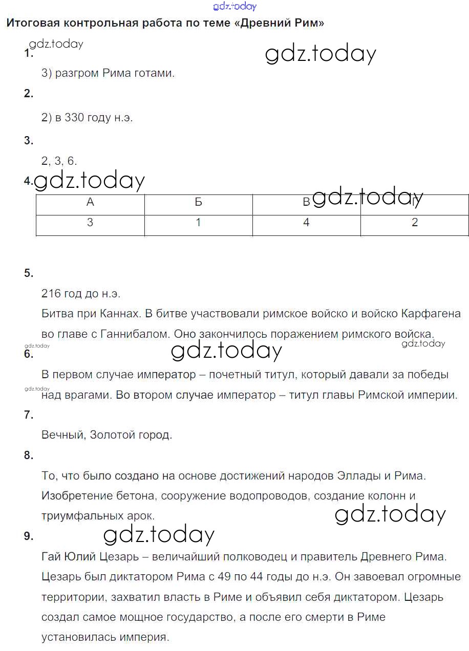 На страницах сайта gdz.today вы найдете учебный и вспомогательный материал, направленный на улучшения знаний школьной программы. ГДЗ - онлайн мир знаний Итоговая контрольная работа по теме Древний Рим Решение к главе 15. Разгром Рима германцами и падение Западной Римской империи Вариант №1 Проверочным и контрольным работам по Истории для 5 класса Крючкова  Просвещение  2015