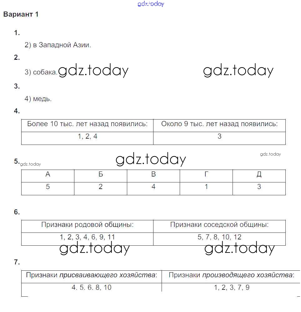 На страницах сайта gdz.today вы найдете учебный и вспомогательный материал, направленный на улучшения знаний школьной программы. ГДЗ - онлайн мир знаний Проверочная работа Решение к главе 2. Первобытные земледельцы и скотоводы Вариант №1 Проверочным и контрольным работам по Истории для 5 класса Крючкова  Просвещение  2015