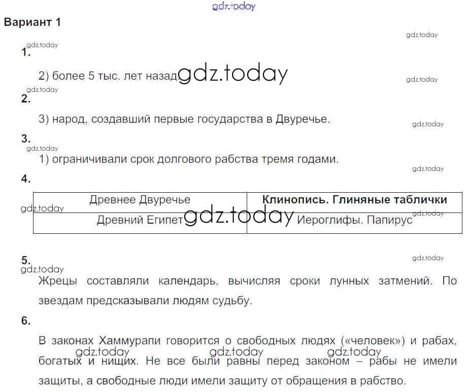 Ответы к Проверочная работа-1 Решение к главе 5. Западная Азия в древности Вариант №1 Проверочным и контрольным работам по Истории для 5 класса Крючкова  Просвещение  2015