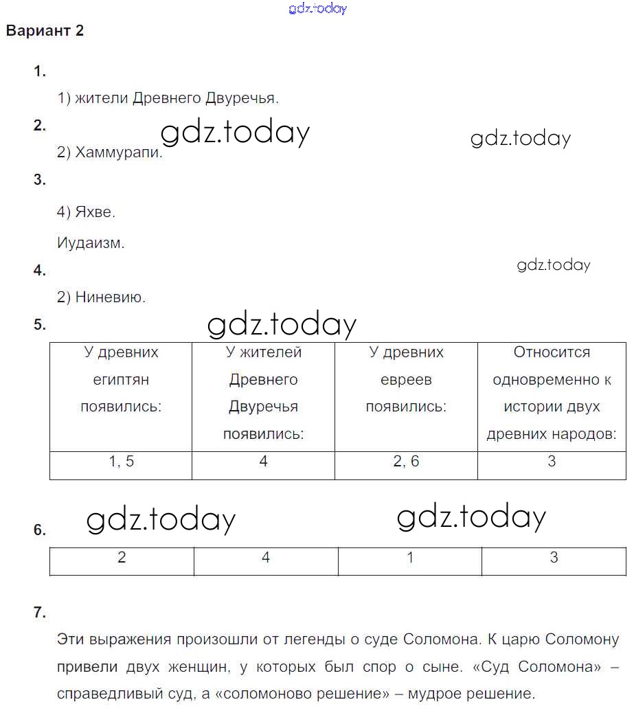 На страницах сайта gdz.today вы найдете учебный и вспомогательный материал, направленный на улучшения знаний школьной программы. ГДЗ - онлайн мир знаний Итоговая контрольная работа к главе Западная Азия в древности Решение к главе 5. Западная Азия в древности Вариант №2 Проверочным и контрольным работам по Истории для 5 класса Крючкова  Просвещение  2015