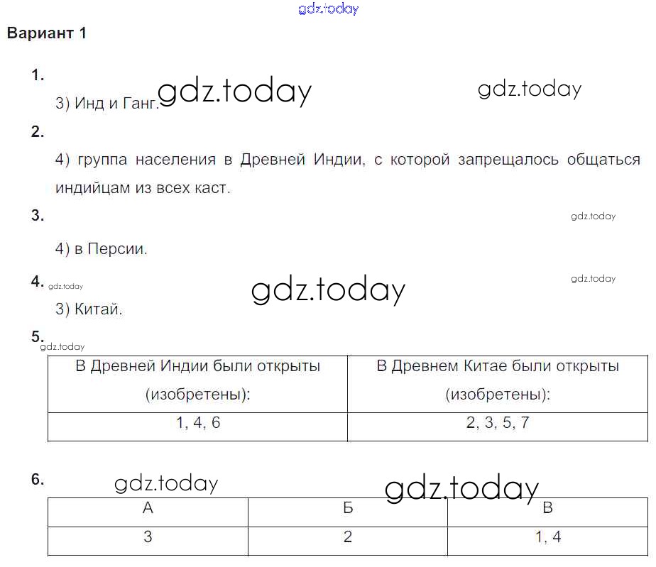 На страницах сайта gdz.today вы найдете учебный и вспомогательный материал, направленный на улучшения знаний школьной программы. ГДЗ - онлайн мир знаний Итоговая контрольная работа к главе Индия и Китай в древности Решение к главе 6. Индия и Китай в древности. Древняя Греция Вариант №1 Проверочным и контрольным работам по Истории для 5 класса Крючкова  Просвещение  2015