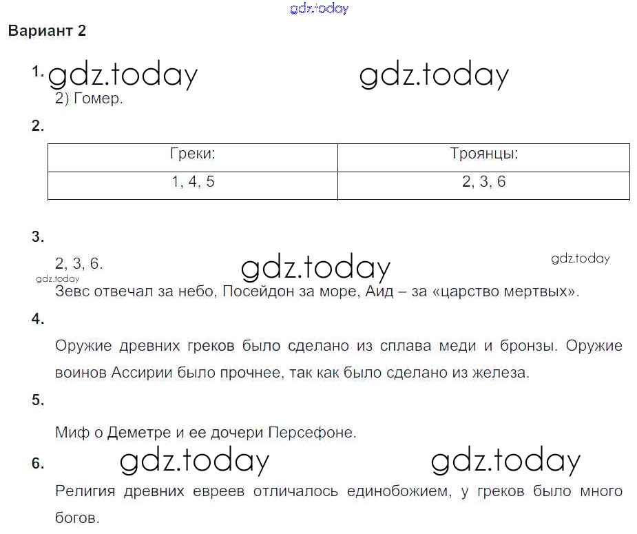 На страницах сайта gdz.today вы найдете учебный и вспомогательный материал, направленный на улучшения знаний школьной программы. ГДЗ - онлайн мир знаний Проверочная работа-№2 Решение к главе 7. Древнейшая Греция Вариант №2 Проверочным и контрольным работам по Истории для 5 класса Крючкова  Просвещение  2015