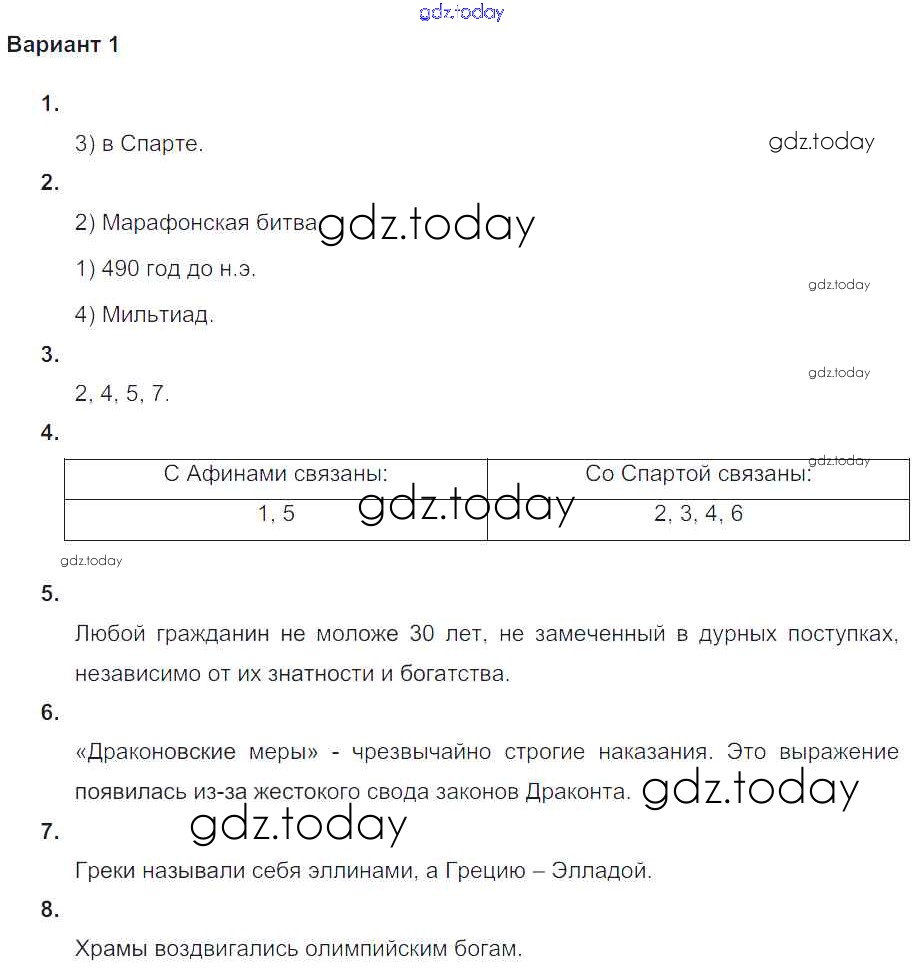 На страницах сайта gdz.today вы найдете учебный и вспомогательный материал, направленный на улучшения знаний школьной программы. ГДЗ - онлайн мир знаний Итоговая контрольная работа к главе Полисы Греции и их борьба с персидским нашествием Решение к главе 8. Полисы Греции и их борьба с персидским нашествием Вариант №1 Проверочным и контрольным работам по Истории для 5 класса Крючкова  Просвещение  2015