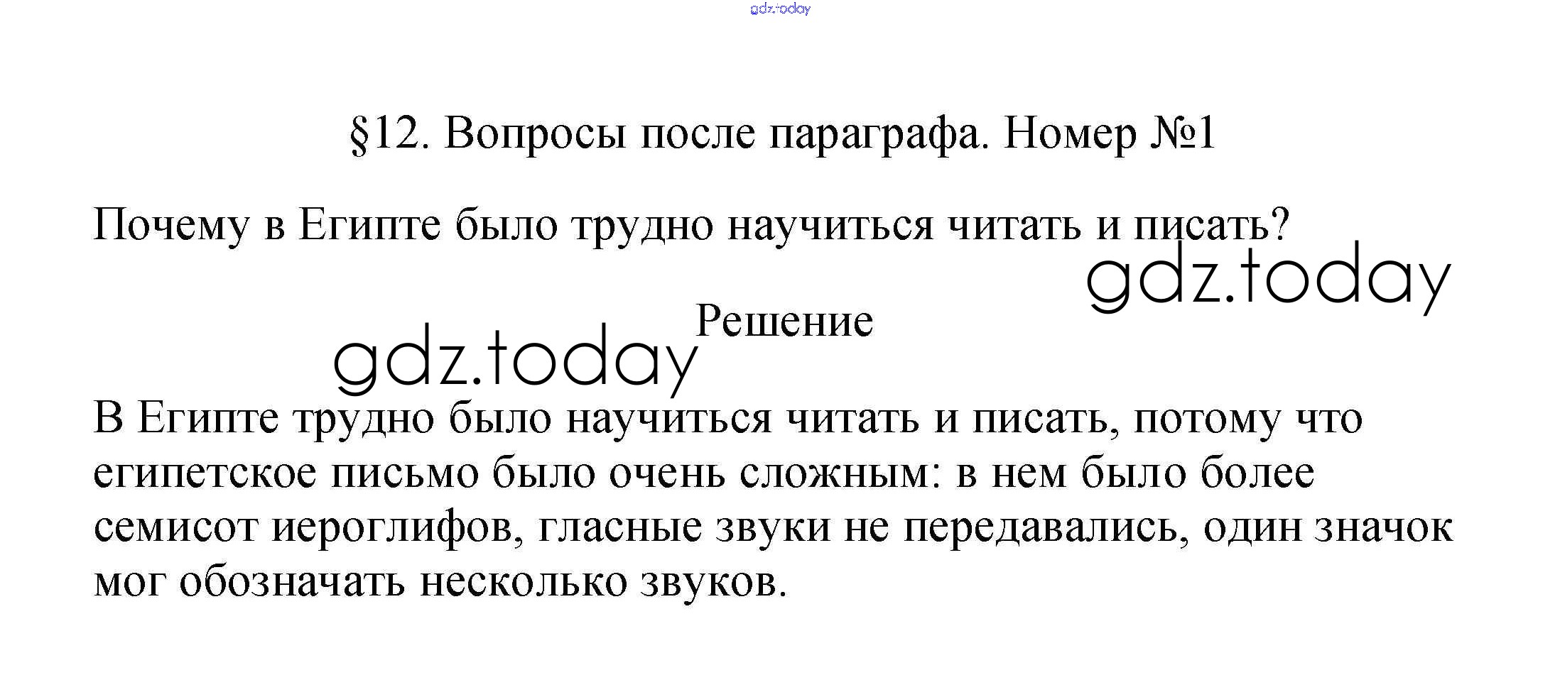На страницах сайта gdz.today вы найдете учебный и вспомогательный материал, направленный на улучшения знаний школьной программы. ГДЗ - онлайн мир знаний §12. Письменность и знания древних египтян 1 Учебнику по Истории для 5 класса Вигасин, Годер Просвещение 2010