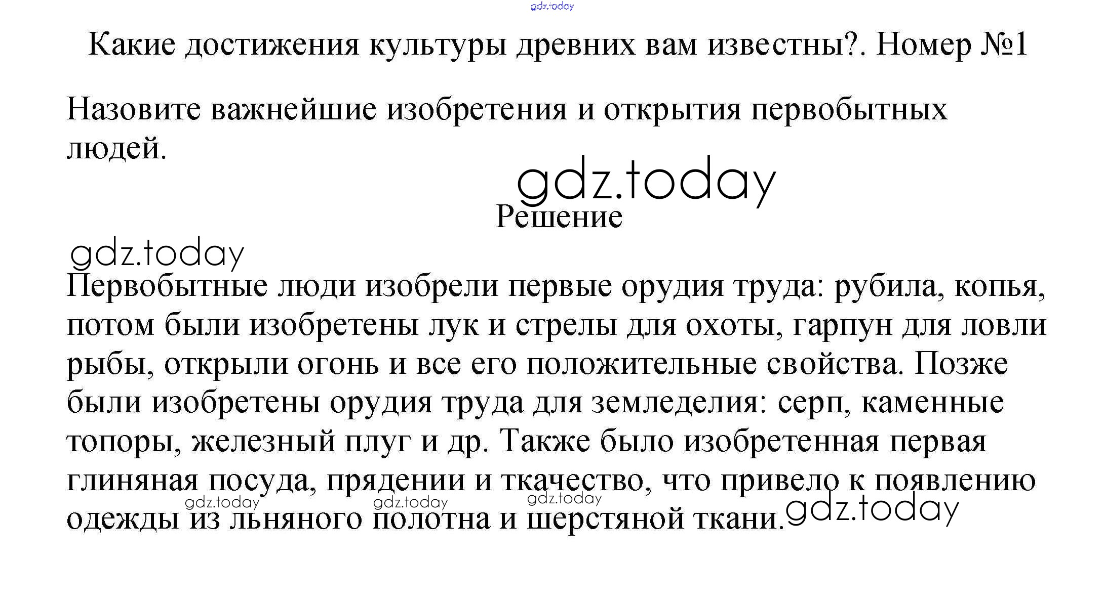 На страницах сайта gdz.today вы найдете учебный и вспомогательный материал, направленный на улучшения знаний школьной программы. ГДЗ - онлайн мир знаний Какие достижения культуры древних вам известны? Проверьте, хорошо ли вы помните историю Древнего мира 1 Учебнику по Истории для 5 класса Вигасин, Годер Просвещение 2010