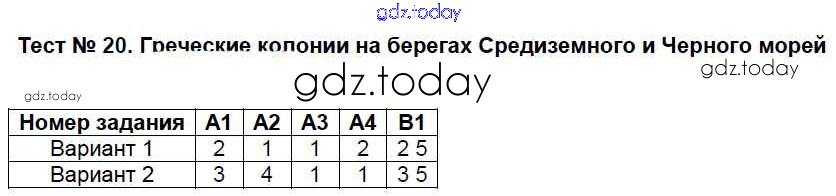 На страницах сайта gdz.today вы найдете учебный и вспомогательный материал, направленный на улучшения знаний школьной программы. ГДЗ - онлайн мир знаний Решение к тестам  Тест №20. Греческие колонии на берегах Средиземного и Черного морей Контрольно-измерительным материалам (КИМ) по Истории для 5 класса Волкова  ВАКО  2017