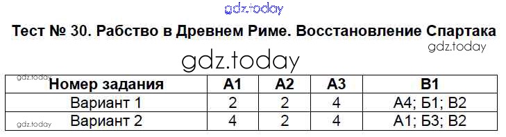 На страницах сайта gdz.today вы найдете учебный и вспомогательный материал, направленный на улучшения знаний школьной программы. ГДЗ - онлайн мир знаний Решение к тестам  Тест №30. Рабство в Древнем Риме. Восстановление Спартака Контрольно-измерительным материалам (КИМ) по Истории для 5 класса Волкова  ВАКО  2017