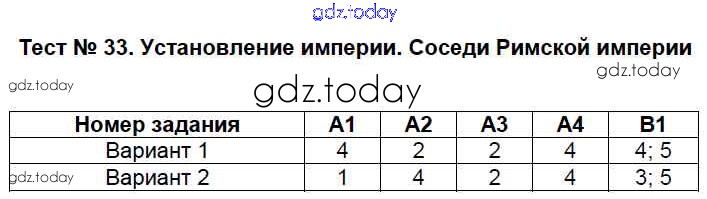 На страницах сайта gdz.today вы найдете учебный и вспомогательный материал, направленный на улучшения знаний школьной программы. ГДЗ - онлайн мир знаний Решение к тестам  Тест №33. Установление империи. Соседи Римской империи Контрольно-измерительным материалам (КИМ) по Истории для 5 класса Волкова  ВАКО  2017